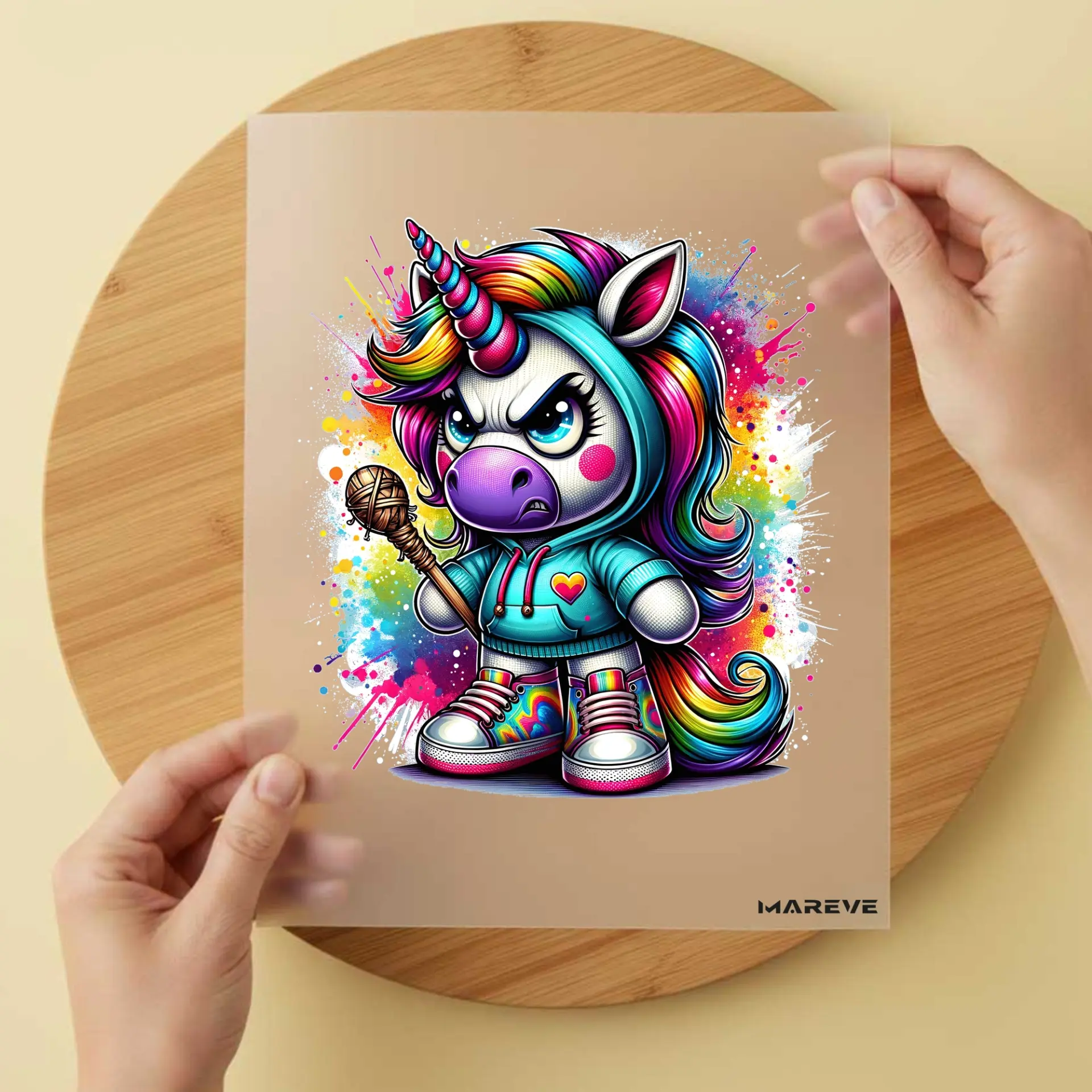 Bügelbild/Sticker -Böses Einhorn – Strohkeule-Türkise Jacke