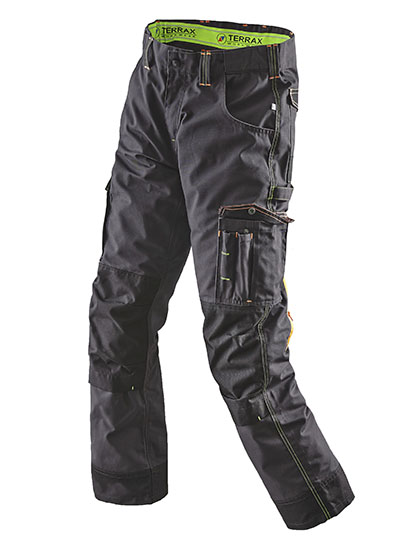 Verdeckter elastischer Einsatz im Hosenbund und (Anti-Slip-Solution) | Zwei Gesäßtaschen mit Patte und Druckknopf gesichert | Hosenschlitz mit Metallreißverschluss | Kunststoffbeschichterer Metallknopf | Zwei große Einschubtaschen | Aufgesetzte Schenkeltasche rechts mit großer Cargofalte. mit Patte und Druckknopf gesichert sowie zusätzlichem Zollstockfach und kleiner zusätzlicher Tasche mit Patte und Klett gesichert | Aufgesetzte Schenkeltasche links mit Cargofalte. Patte mit Klett gesichert sowie zusätzliche Tasche für Stifte. Laserpointer etc. | Stofflasche zum Befestigen von Accessoires am linken Hosenbein | Effektive Luftzirkulation durch Lüftungsreißverschlüsse mit Mesheinsatz an den Oberschenkeln | Ergonomisch geformte Kniepolstertaschen außen (600D Polyester Oxford/PU. H: 28cm. Breite oben: 23cm. Breite unten: 19cm) | Reißfeste Dreifachnaht | Terrax Workwear Label | Details in Kontrastfarbe